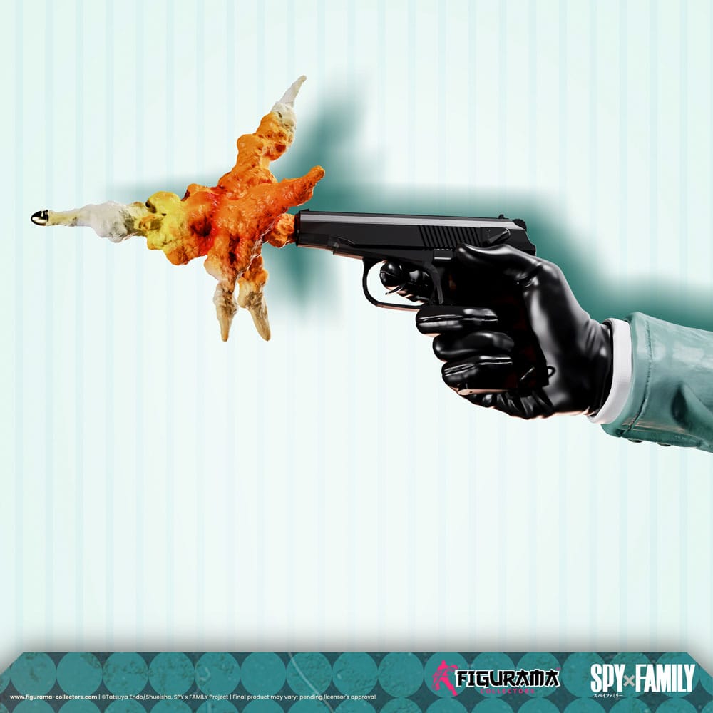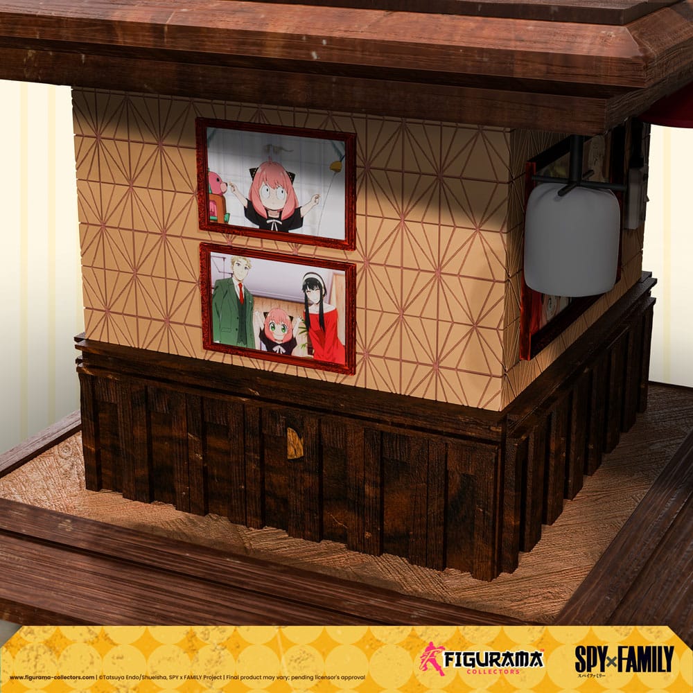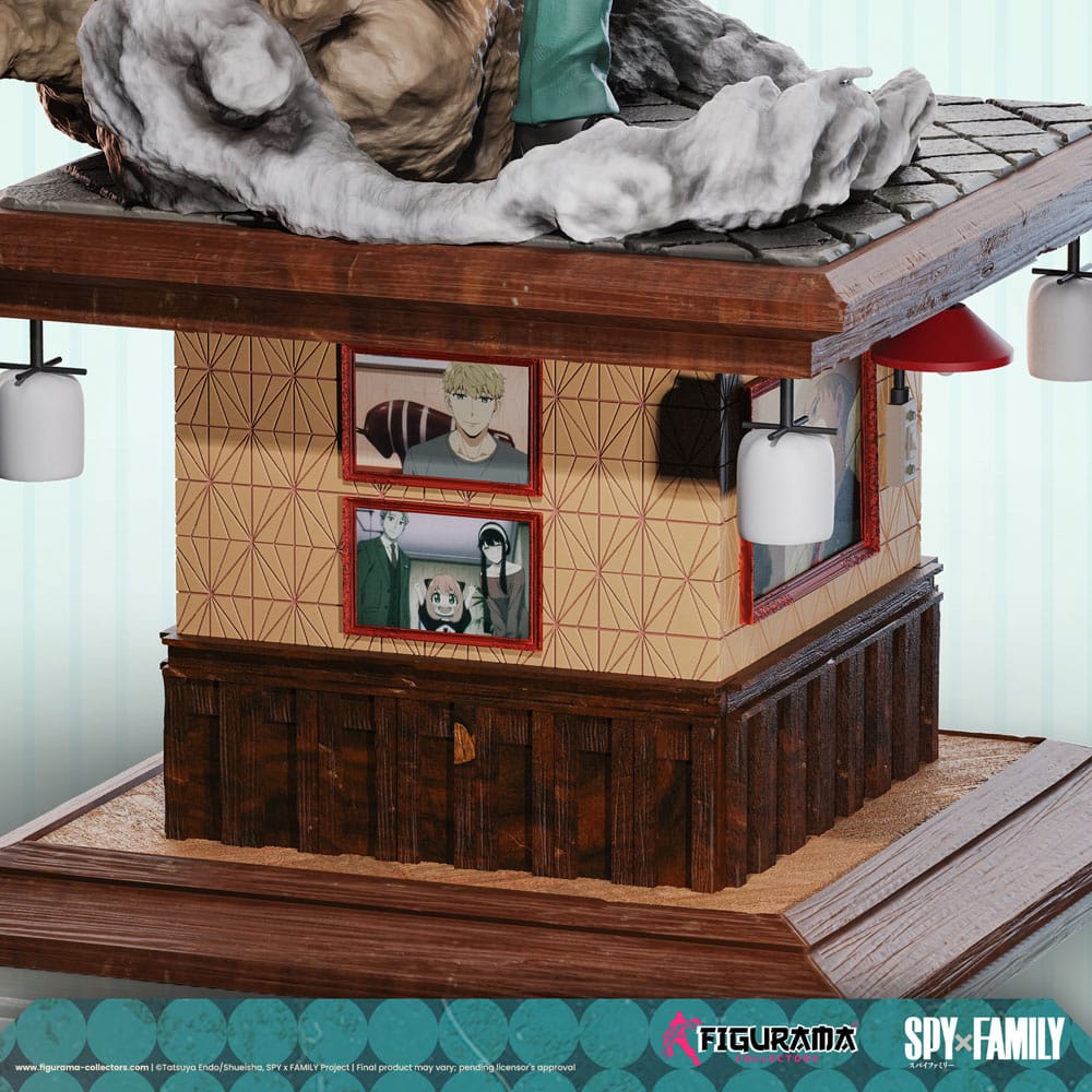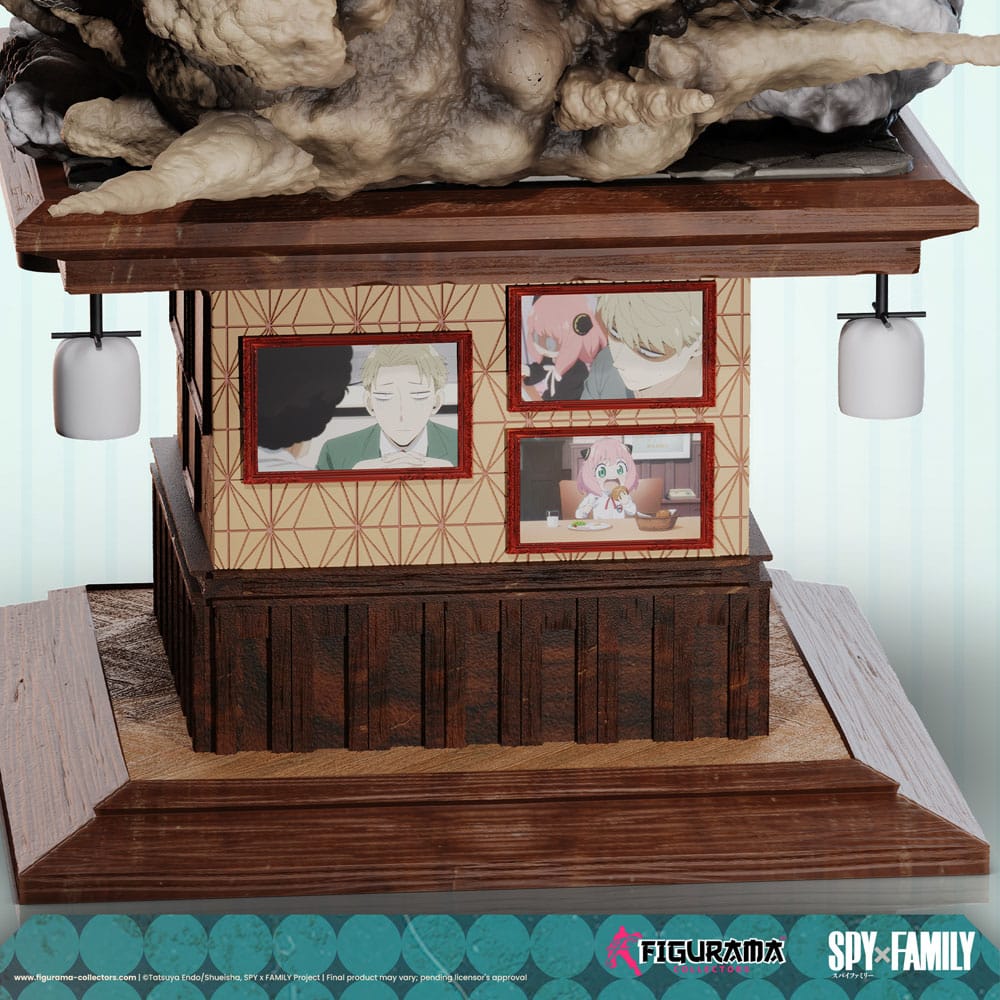 Loid Forger's statue showcases him as the renowned spy and master of disguise "Twilight". He is shown with his cool, calm yet focused demeanor despite being amid the action with bullets flying and explosions just behind him. The base is a nod to the Forger family home, with the walls set with pictures of the family wrapped around all sides.
