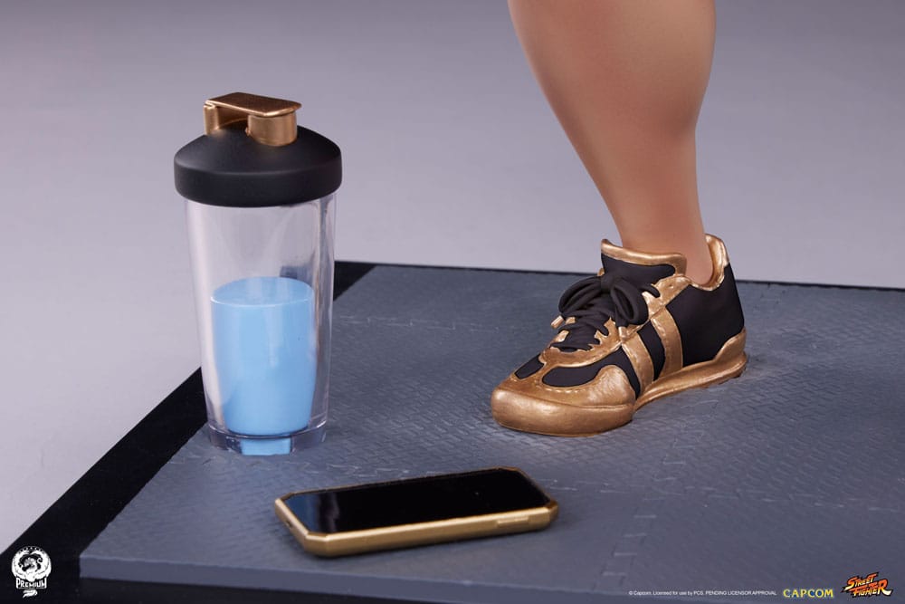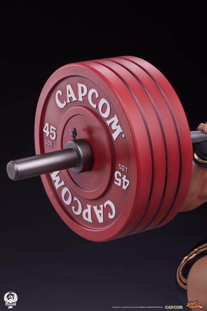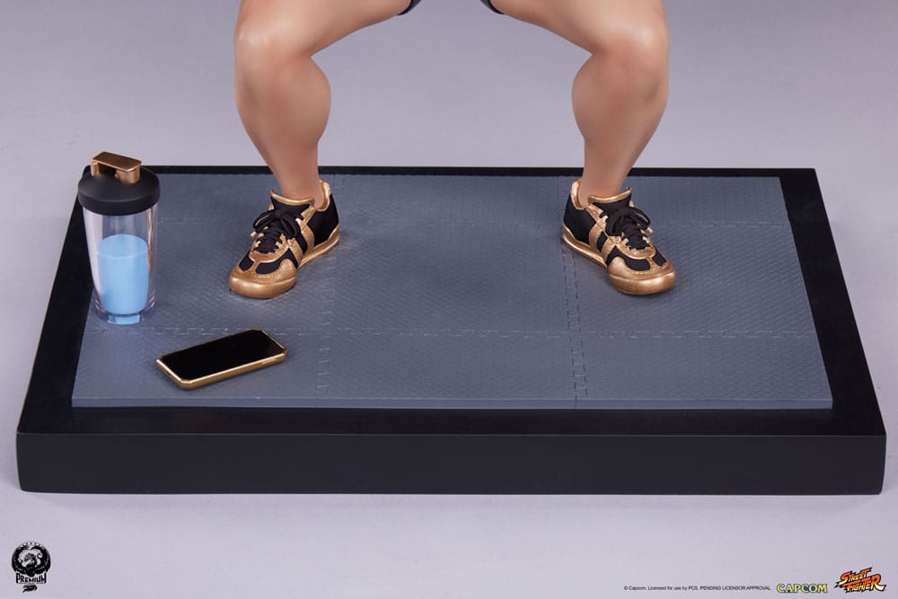 Every detail of the statue is expertly painted, showcasing a more casual take on Chun-Li's fan-favorite evening wear look. Her black shorts with gold trim are a perfect match for her stylish sneakers and lifting gloves. The detailed plates at either end of the barbell sag under their own weight showing just how much hard work is needed to pull off the powerful kicks Chun-Li is known for.